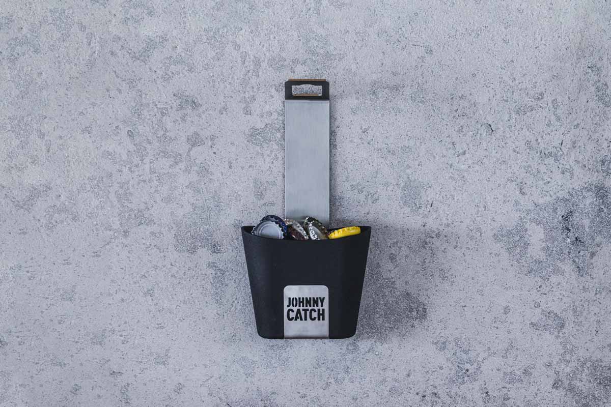 JOHNNY CATCH Cup – der wohl fangsicherste Wand-Flaschenöffner der Welt. Fängt bis zu 60 Kronkorken im abnehmbaren Auffangbecher! Stabile Wandmontage ohne Schrauben.